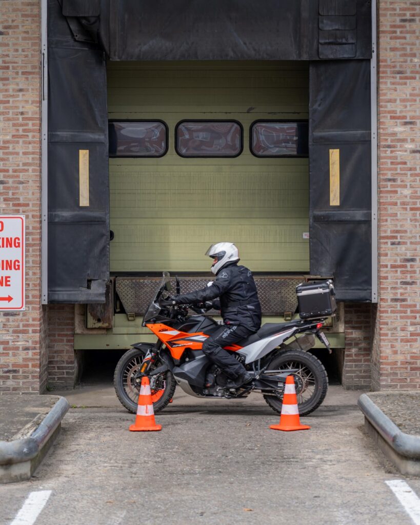 De testritten verlopen onder politiebegeleiding. Daardoor kan je in realistische omstandigheden op de openbare weg rijden, terwijl alles tegelijk gecontroleerd en veilig georganiseerd blijft. Zo krijg je een correct beeld van het rijgedrag van de motorfiets — iets wat je op een statische voorstelling nooit kan ervaren.